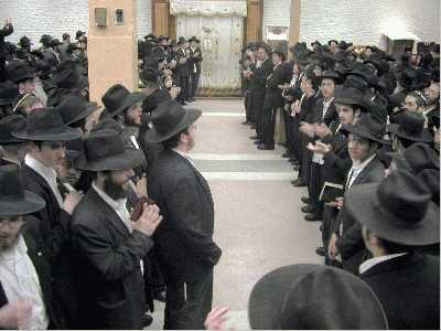 3.30, קדיש אחרון של תפילת מנחה הסתיים. שקט שורר בזאל. מחלקה הקדמי של בימת ההתוועדויות,נשמעת ההכרזה בעשרות קולות צעירים: "יחי אדוננו מורנו ורבנו מלך המשיח לעולם ועד!" קהל המאות מחרה ומחזיק אחריהם. |