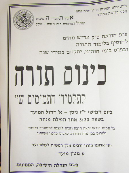 כינוס תורה ע"פ הוראת הרבי ב770