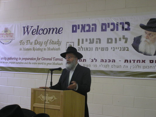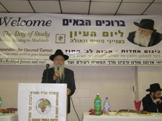 את המושב התכבד להנחות הרב שלום יעקב חזן שפתח ב'דבר מלכות' וביאר נחרצות, שאין אנו צריכים להתעצב חס ושלום מהעלם וההסתר הנורא בו אנו נמצאים, משום שמרה שחורה זוהי עצת היצר. "אנו חסידים צריכים לדבוק באמונתנו היוקדת, ולצפות שבכל רגע הרבי יתגלה ויגאל אותנו". מילים כדרבנות אודות נבואתו של הרבי, דיבר השליח הנודע הרב העשיל גרינברג הידוע כנואם בחסד עליון שידו רבה לו במסירת הרצאות מרתקות אודות נושאי 'גאולה ומשיח'. הרב גרינברג ביאר בארוכה את נקודת האמונה שהיא למעלה מהסתכלות שכלית ודחה מכל וכל, שחס ושלום לחשוב שמא הרבי קיווה בדבריו שתבוא הגאולה, ותו לא. "'אט אט משיח', 'לאלתר לגאולה' ו'נגמרה עבודת הבירורים' אמר הרבי מה"מ בנבואה - לא בתקווה. ועובדת היות נבואה בדורנו, אנו יודעים מדברי הרמב"ם שהוא הפוסק היחיד בעניני 'משיח' באגרת תימן, שלפני הגאולה תחזור הנבואה. את הוודאות שדבריו של הרבי נאמרו בנבואה, ביאר דרך דוגמאות רבות, בניהם שיחתו המדהימה של הרבי שכיום אנו יודעים שנאמרה בנבואה בעניין כיבוש עיראק ותפיסתו של הרודן - ימח שמו - סאדם חוסיין. הדובר הבא היה הרב ישראל פריד, שליח הרבי מה"מ באוניברסיטה במנהטן, שדיבר בארוכה על הצורך והמחויבות של פרסום המופתים והניסים שקורים בכל יום. בהמשך הביא סיפור מדהים שאירע בנוכחותו. "באחת הפעמים שעברתי על יד הרבי בחלוקת דולרים, ראיתי לפני אדם שביקש ברכה עבור בנו, הרבי בירך את בנו וביקש שיבדקו את תפיליו. כשיצאתי מהרבי נדהמתי, מהיכן ידע הרבי שזה בן?! ועוד, מהיכן ידע שהוא אחרי גיל בר מצווה?!. מאוחר יותר כשביקרתי אצל בן דודי בפלטבוש, שידעתי שכבר כמה שנים נשוי ואין לו ילדים, סיפרתי לו את שראו עיני. הוא ניגש אל הרבי, ובי"ט כסלו אותה שנה זכה לחבוק בן". "פרסום זהותו של משיח, אינו מפריע לאף אחד. זה טעות מיסודה לחשוב כך, אם היה זה מתקבל אצלנו זה היה פשוט וברור לכולם. לאחרונה נכנסתי לקניות בחנות בלאוררי סייד - מנהטן ופגשתי שם חסיד בעלז שביקש לשוחח איתי. לדבריו, בשביעי של פסח הגיעו לבית כנסת בו הוא מתפלל בחורים חב"דים חדורי תחושת שליחות בצורה בלתי רגילה וללא משא פנים, מלאים באמונה כרימון, דיברו בקחצהייט רב על משנתו של הרבי ועל היותו מלך המשיח. אני מאמין בזה, סיים, אך חוששני שלא כך הם פני הדברים אצל כל המתפללים". "כשסיים את דבריו שאלתי אותו, הרשו להם לדבר?!, הוא ענה שכן. שנה הבאה הם יבואו בשנית?! הוא ענה שלפי מה שידוע לו אין שום התנגדות. אז הגה עצמך, פניתי אליו ישירות. אם אתה לא היית אומר לי שאתה מאמין ברבי כמשיח גם לא הייתי יודע זאת". המנחה מודה לרב פריד על נאומו המיוחד, ומזמין את המרא דאתרא הרב אהרון יעקב שווי, לשאת דברים. הרב שווי ניגש לדוכן הנואמים והביא במילים נהירות את ברכת השכונה והבד"ץ למעמד. "צריך" אמר בנרגשות, "שעניין משיח יהיה חדור אצלנו במעשה דיבור ומחשבה, מהרגע שבו אנו נוטלים ידים עד קריית שמע". דברים נרגשים אודות שלימות העם והארץ נשא הרב שמואל חפר חבר אגו"ח ומנהל בית רבקה בארה"ק. את דבריו פתח בהביאו את דבריו של הרבי בהתוועדות בשנת תש"כ אודות עת רצון שהיית אותו זמן בשמים לשחרור יהודי רוסיה ממסך הברזל, ודבריו של הרב ניסן נימנעוו על כך. "צריך להבין, אמר בצער, כיום קרוב למיליון גויים חיים בארץ. ההתבוללות היא נוראה ואיננה ניתנת לתיאור. בעבר שמעתי שפנו אל אדמו"ר ידוע והסבירו לו על האסון שעומד חלילה להתרגש על העם היהודי בעקבות אי תיקון חוק מיהו יהודי. זה, במקום שיבין את העניין, הפטיר בפשטות 'זה לא הבשר שלנו'. כמו"כ חקוק בזיכרוני שיחה שהיית לי עם יהודי שומר תומ"צ בעל ההשפעה שלטונית רבה בזמן ממשלת שמיר, זה ששמע את דברי על התבוללות הנוראה שישנה בארץ הצדיק אותי וטען; כן, אני יודע, שמיר הוא שקרן גדול, הוא הבטיח לנו כסף לישיבות ולא קיים את הבטחתו. הבטתי בו המום, אני מדבר אתך על סכנה קיומית ונוראה ואתה מדבר לי על סכומי כסף לישיבות". האי אכפתיות גם בנושא שלימות הארץ היא בעוכרנו, היל"ת ישנה תוכנית מסוכנת ונוראה ש