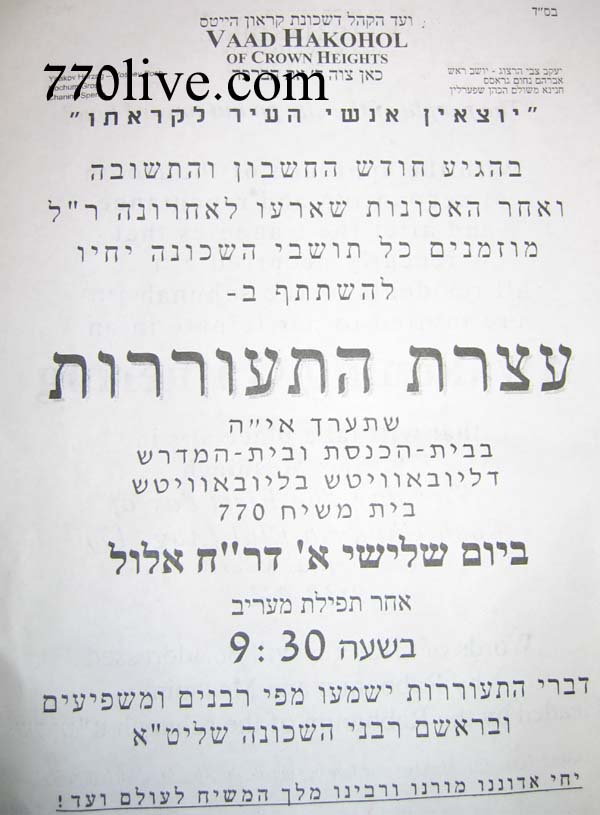 ברגעים אלו הסתיים כינוס ההתעוררות שאירגן וועד הקהל. הכינוס התקיים לכבוד ר"ח אלול וגם עקב פטירתן הטראגית של האחיות חיה מושקא ושטערנא אסתר ע"ה שמואלי. את הכינוס פתח בדבר מלכות הרב שלום יעקב חזן שבסיום דבריו הזמין את המרא דאתרא הרב אהרון יעקב שווי. הרב שווי דיבר על כוחה של האחדות, האחדות בנינו זה כמו בים כאשר אוניה בסכנת טביעה כל האוניות שבסביבה מגיעות לעזור לה אותו דבר זה אצלנו אנ"ש והתמימים כאשר יודעים על מי שהוא שעבר לו בגשמיות או ברוחניות זה צריך להפריע לנו. בסיום דבריו סיפרהרב שווי על כך שפעם נהגו לתת לחתן מיקרופון כדי שכל הקהל (גם הנשים) יוכלו לשמוע אותו ולשמור על השקט אך היום שמבזבזים את הכסף על מותרות כנראה שלא נשאר כסף בשביל המיקרופון. כמו"כ דיבר הרב שווי שבחתונות של אנ"ש כדאי לשמיע מוזיקה חסידית (חב"דית) לאחר דברי הרב שווי הוזמן לנעול את הכינוס הרב דוד שלום פייפ. הרב פייפ עמד על כך שאיננו עושים ככל יכולתנו לבצע את המבצעים של הרבי ולדוגמא איך צריכים להתנהג סיפר: היה יהודי חב"דניק שהרבה שנים לא נולדו לו ילדים בצר לו הגיע לחלוקת דולרים וביקש ברכה לילד הרבי הביא לו דולר ואמר לו "תקנה בית". כשיצא מ770 לא הבין מה הקשר בין בית לילד הוא לקח את שטר הדולר ובהה בו כאשר נץפסו עיניו על מספר השטר. לפתע נפל לו הרהור אולי לנסות לחפש דירה כמספר שטר הדולר הוא נסע לפלטבוש למס' של הדולר ודפק בדלת לשאלת בעל הבית מה הוא מחפש הוא שאל אותו אם הוא מוכר את הבית? בעל הבית ענה לו בחיוב והוא קנה את הבית וכך כשסגר שנה בבית נולד לו תינוק זוהי האמונה האמיתית בדברי הרבי סיים הרב פייפ להשקיע את הכוח והמרץ במבצעים וזה יגרום להתגלותו של הרבי.