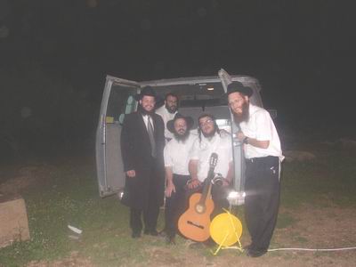 ר' דניאל גראבסקי, ר' שבתי בנדט ואחד מהתושבים ליד ניידת ההדפסה