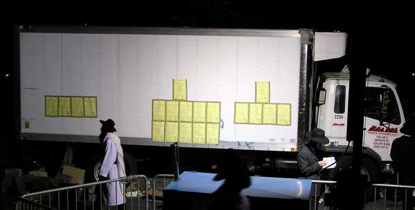 משאית המזון ועליה מודעות המזמינות את הקהל